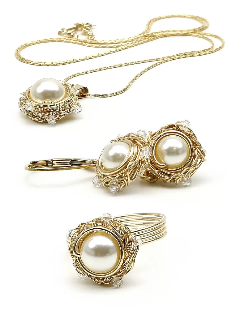 Set 3 piese: cercei tortite cu inchidere, pandantiv si inel, din gold filled 14K